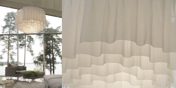 Juhla 115 cm on Juhla -valaisinten suurin koko. Sen muodosssa voi nähdä muistumia juhlahameiden helmoista. Laskostettu paloturvallinen kangas muodostaa varjostimesssa luonnollisen, elävän rytmin. Varjostimen kerroksittainen tekstiili tasoittaa kolmen polttimon valon silmälle miellyttäväksi.