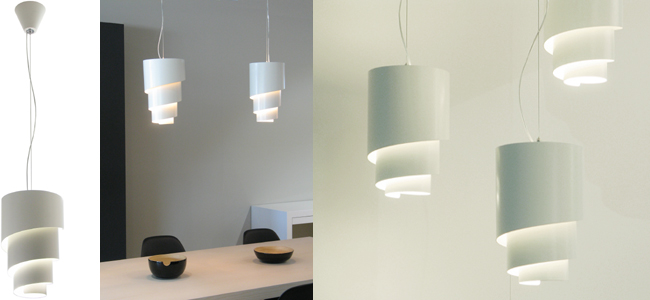 Laserleikkauksen keinoin toteutettu teräsvaipan aukotus päästää polttimon valon kulkemaan spiraalin toistuvien kerrosten läpi. Kerroksista takaisin heijastuva valo valaisee varjostimen pinnat ja saa metallisen varjostimen näyttämää keveän leijuvalta, valoa hehkuvalta muodolta. Valaisimet sopivat yksittäin tai ryhminä käytettäviksi.
